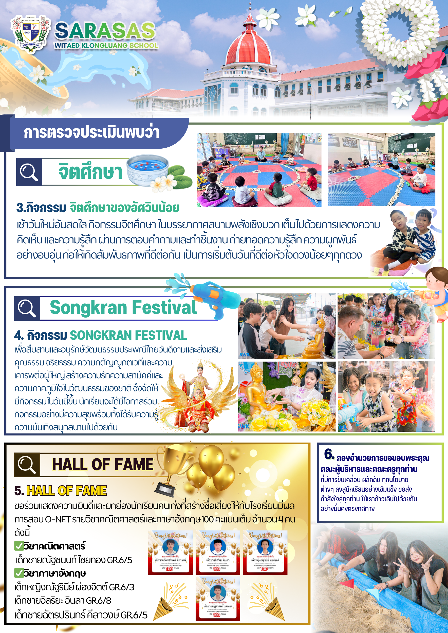 กองอำนวยการออกตรวจประเมินคุณภาพการศึกษาภายในโรงเรียนตามเกณฑ์คุณภาพการศึกษาเพื่อการดำเนินการที่เป็นเลิศประจำปีการศึกษา 2568 (Summer 2025) ของกลุ่มสถาบันการศึกษาในเครือสารสาสน์วันศุกร์ที่ 18 เมษายน พ.ศ. 2568 โรงเรียนสารสาสน์วิเทศคลองหลวง ได้รับการตรวจประเมินคุณภาพการศึกษาภายในระดับโรงเรียนตามเกณฑ์คุณภาพการศึกษา เพื่อการดำเนินการที่เป็นเลิศประจำปีการศึกษา 2568 เพื่อเป็นประโยชน์ต่อการพัฒนาคุณภาพให้ได้มาตรฐานดีเลิศต่อไปคณะตรวจประเมินประกอบด้วย นายมนตรี จันทรวงศ์ , นางสมทรง อธิคมอุภัย โดยมี ดร.สุทธิพงศ์ ยงค์กมล ประธานกรรมการฝ่ายคุณภาพการศึกษา และนายก สภาสถาบันเทคโนโลยีแห่งสุวรรณภูมิ เป็นที่ปรึกษาด้านนโยบาย