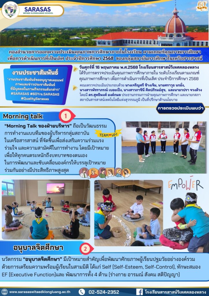 วันศุกร์ที่ 16 พฤษภาคม พ.ศ. 2568 โรงเรียนสารสาสน์วิเทศคลองหลวง ได้รับการตรวจประเมินคุณภาพการศึกษาภายในระดับโรงเรียนตามเกณฑ์คุณภาพการศึกษา เพื่อการดำเนินการที่เป็นเลิศประจำปีการศึกษา 2568 เพื่อเป็นประโยชน์ต่อการพัฒนาคุณภาพให้ได้มาตรฐานดีเลิศต่อไป