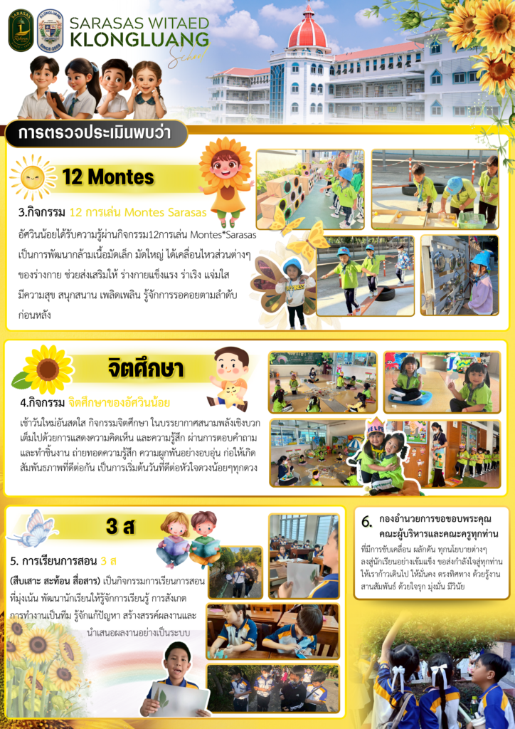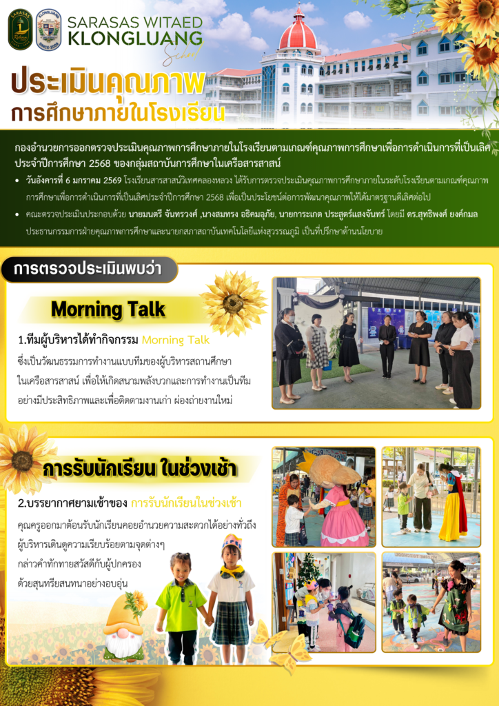 วันที่อังคารที่ 6 มกราคม พ.ศ. 2569 โรงเรียนสารสาสน์วิเทศคลองหลวง ได้รับการตรวจประเมินคุณภาพการศึกษาภายในระดับโรงเรียน ตามเกณฑ์คุณภาพการศึกษา เพื่อการดำเนินการที่เป็นเลิศประจำปีการศึกษา 2568 เพื่อเป็นประโยชน์ต่อการพัฒนาคุณภาพให้ได้มาตรฐานดีเลิศต่อไป