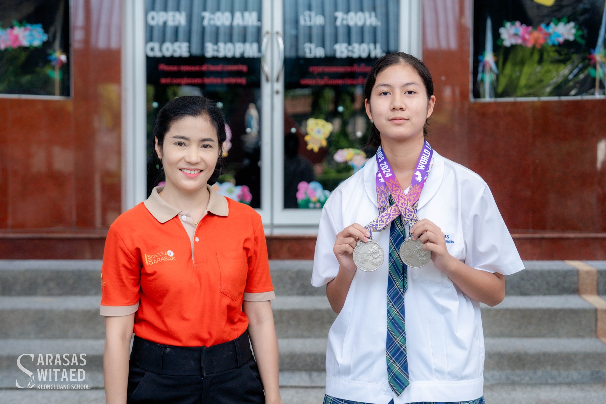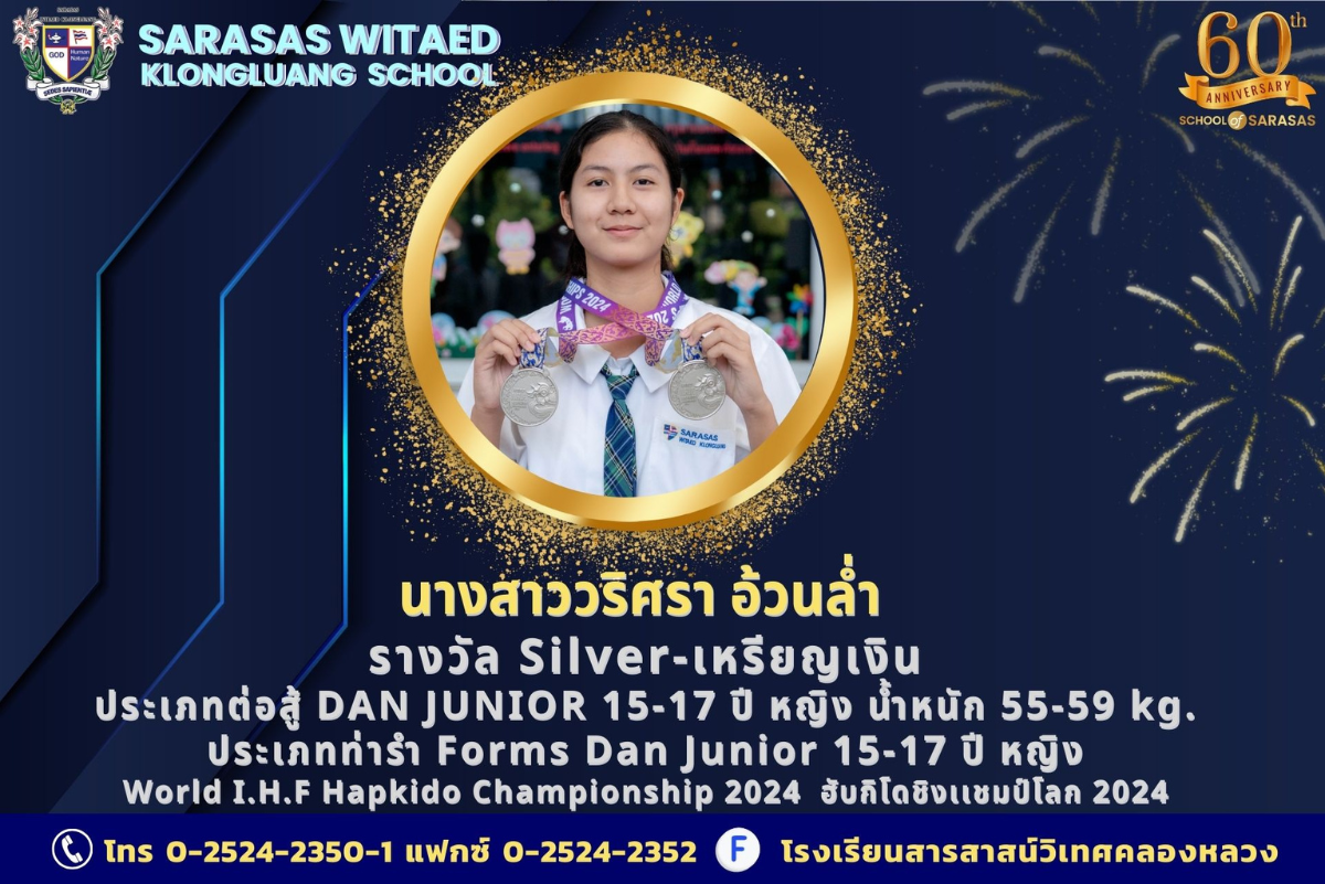 ขอแสดงความยินดีกับความสำเร็จที่ยอดเยี่ยมของนางสาววริศรา อ้วนล่ำ นักเรียนของโรงเรียนสารสาสน์วิเทศคลองหลวง ที่ได้รับรางวัลอันทรงเกียรติในการแข่งขัน World I.H.F Hapkido Championship 2024 ฮับกิโดชิงแชมป์โลก 2024 โดยได้รับสองเหรียญเงินในประเภทต่อสู้และท่ารำ ดังนี้: